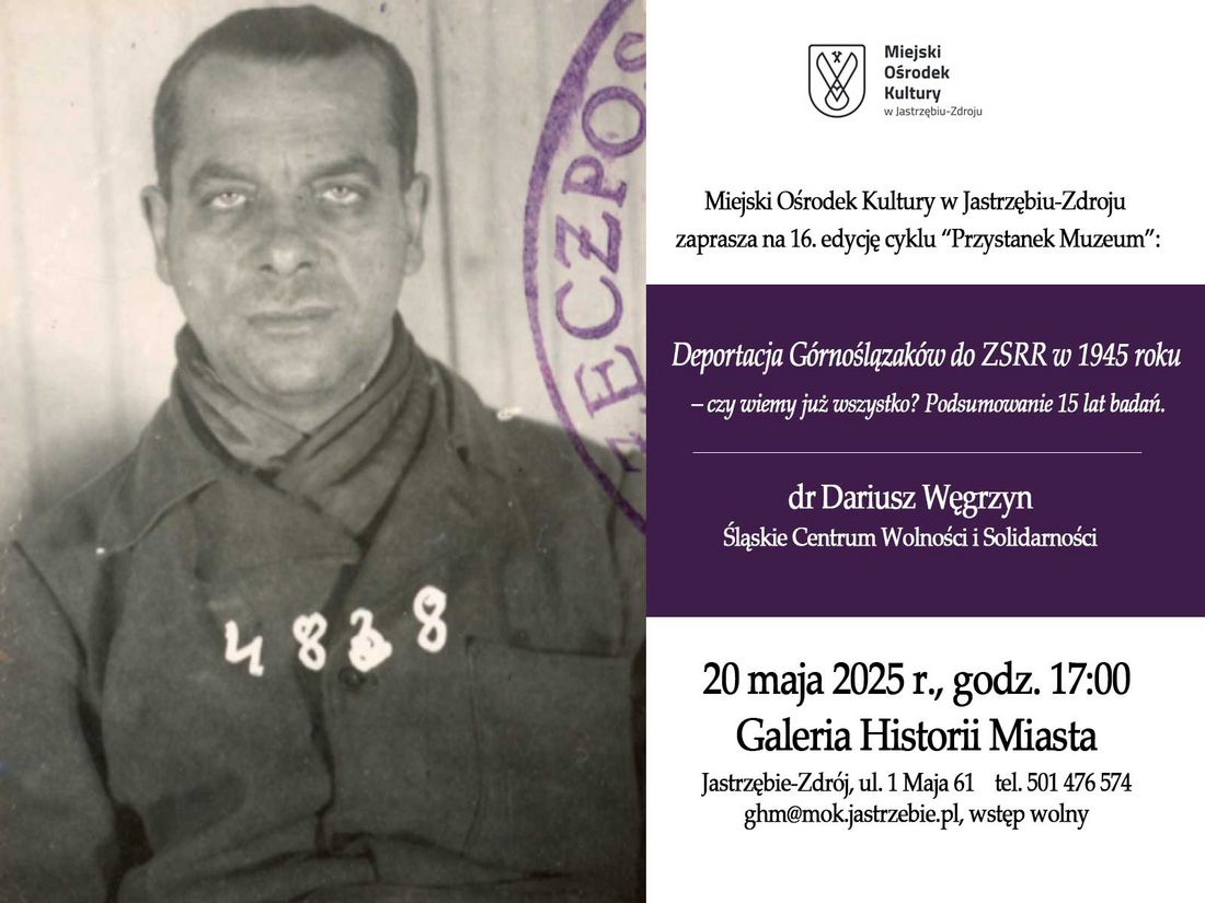 Gościem GHM będzie dr Dariusz Węgrzyn ze Śląskiego Centrum Wolności i Solidarności, autor imponującej trzytomowej publikacji pt. "Księga aresztowanych, internowanych i deportowanych z Górnego Śląska do ZSRR w 1945 roku".