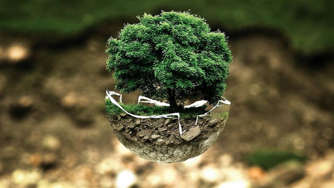 Grafika poglądowa - małe drzewo wyrastające  z fragmentu gleby