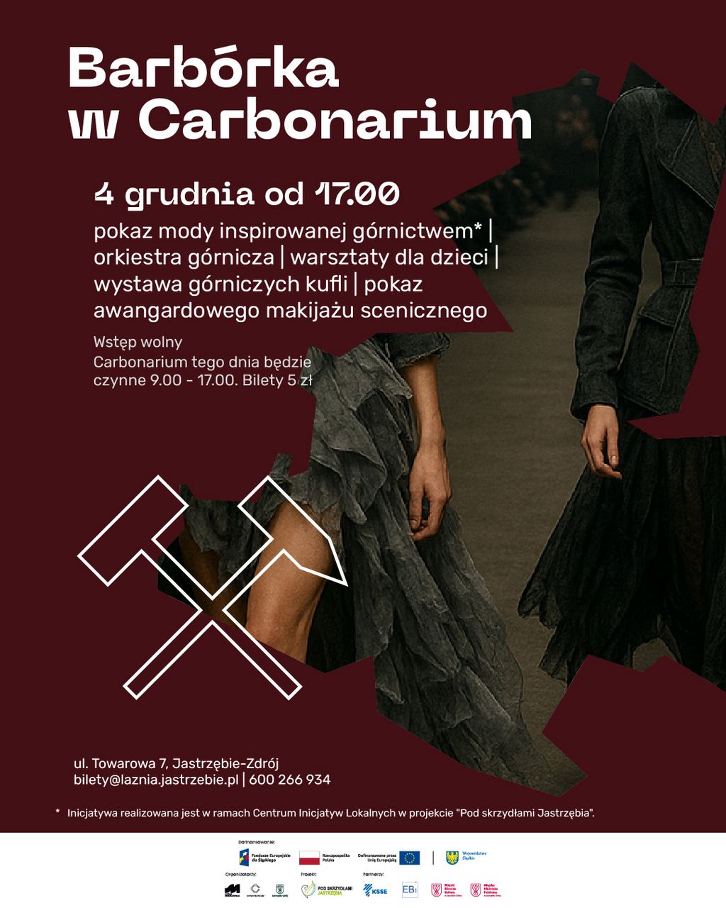 Na koniec pokaz mody Barbórkowy Fashion Day - Węgiel w roli głównej realizowany jest jako inicjatywa lokalna w ramach projektu "Pod skrzydłami Jastrzębia". Wstęp na pokaz mody jest bezpłatny – odbędzie się on na parterze Carbonarium, można w nim uczestniczyć niezależnie od zwiedzania. Dwanaścioro modeli zaprezentuje zarówno tradycyjne stroje górnicze, te związane z codzienną pracą, jak i artystyczne stylizacje wykonane z odpadów przemysłowych, resztek ubrań, elementów metalowych oraz biżuterii z węgla. Pokazowi będzie towarzyszył pokaz scenicznego makijażu. Ciekawostką jest, że zdjęcia modelek prezentujących tego dnia stroje znajdą się następnie w wydanym przez inicjatorów kalendarzu.