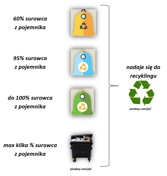 Zebrane selektywnie stanowią cenny surowiec wtórny, który nadaje się do dalszego przetworzenia. Wrzucone zaś do pojemnika na odpady zmieszane (niesegregowane) tracą bezpowrotnie na swojej wartości. Oklejone odpadami kuchennymi, higienicznymi, zmiotkami czy odchodami zwierzęcymi nadają się jedynie w niewielkiej ilości do recyklingu.