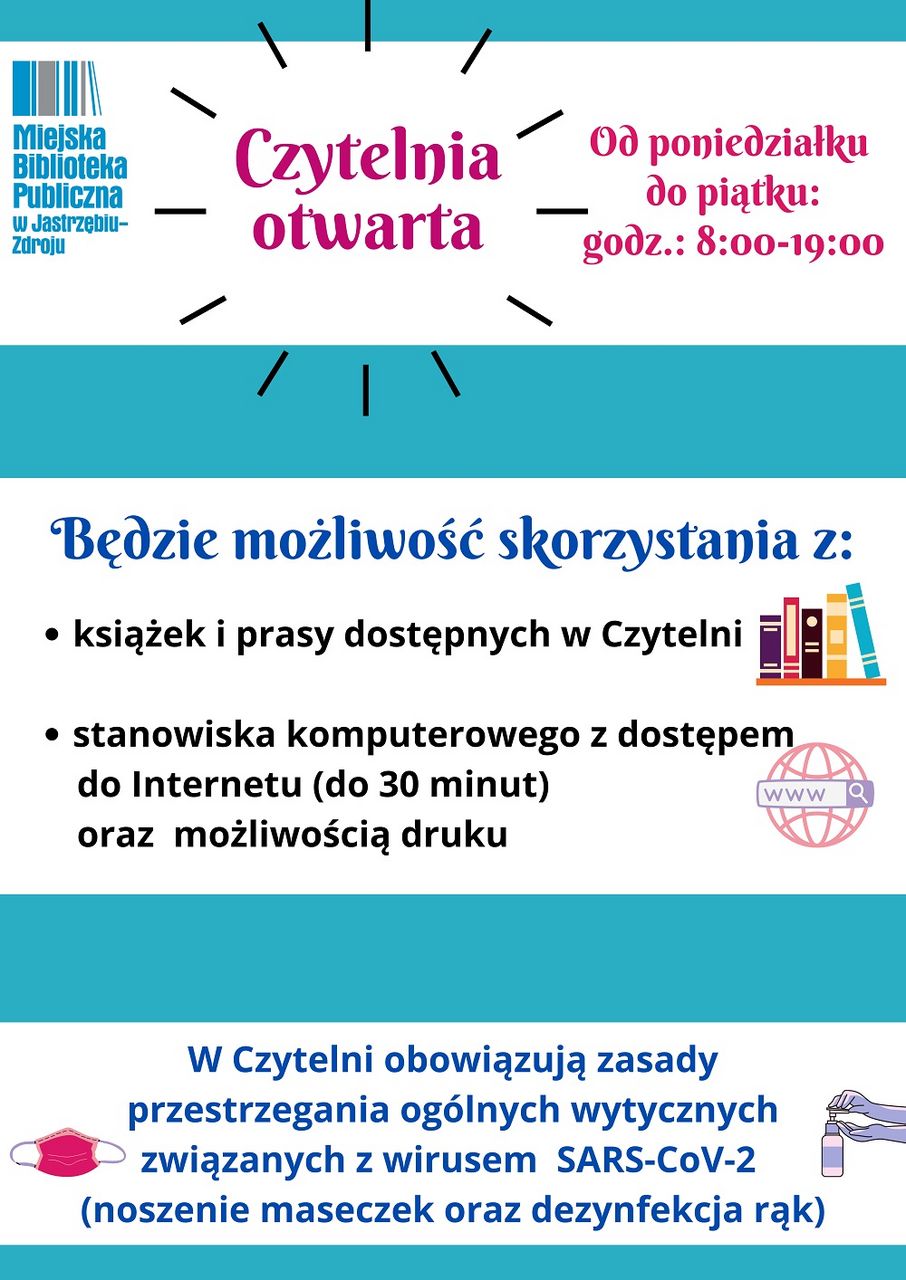 Czytelnia będzie czynna od poniedziałku do piątku w godzinach 8:00 - 19:00.
