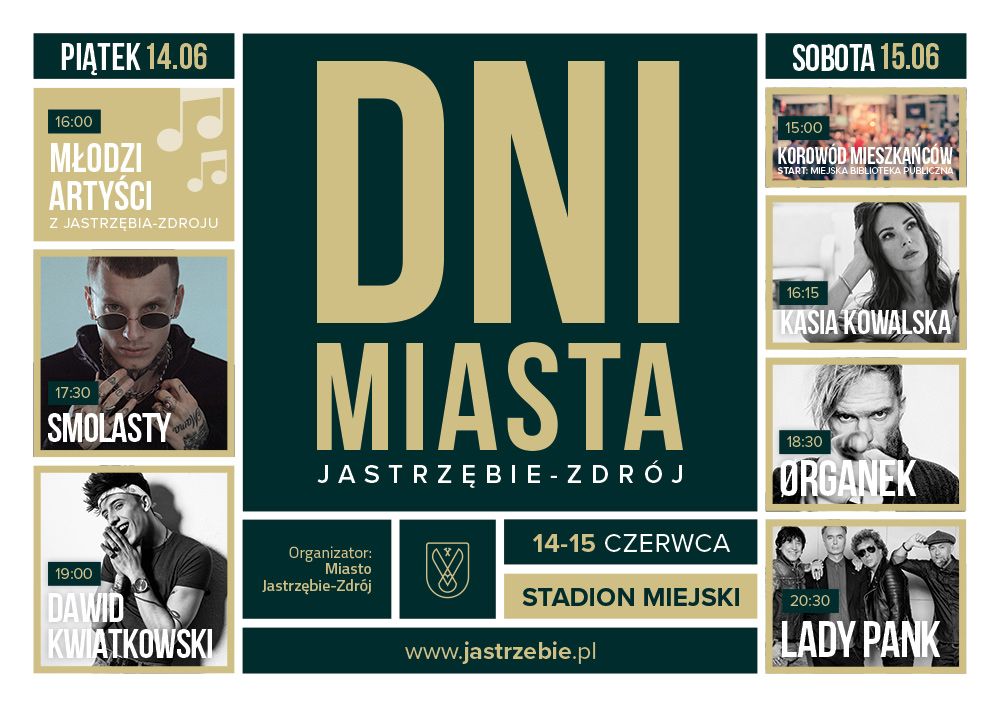 Kto zagra dla nas podczas Dni Miasta? W piątek rozpoczynamy wspólną zabawę o godzinie 16.00. W pierwszej kolejności zaprezentują się młodzi, jastrzębscy artyści. O godz. 17.30 wystąpi Smolasty - polski wokalista, tworzący muzykę z pogranicza R&B, popu i rapu. Zaś w piątkowy wieczór (godz.19.00) na scenie królował będzie Dawid Kwiatkowski – którego debiutancki album „9893” zapisał się w historii polskiej muzyki, jako pierwszy debiutancki krążek, który uzyskał status złotej płyty na trzy tygodnie przed sklepową premierą.