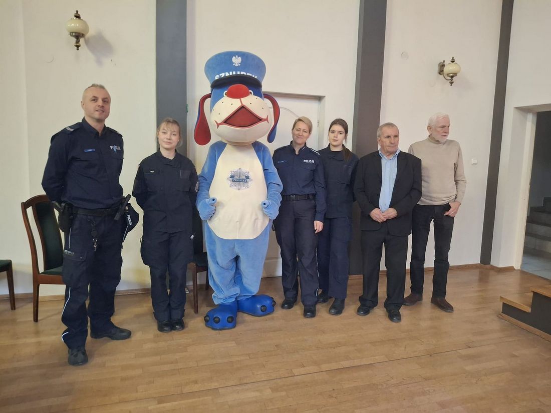 Na scenie Mikołaj, elf, maskotka policji i dwie mundurowe dziewczyny