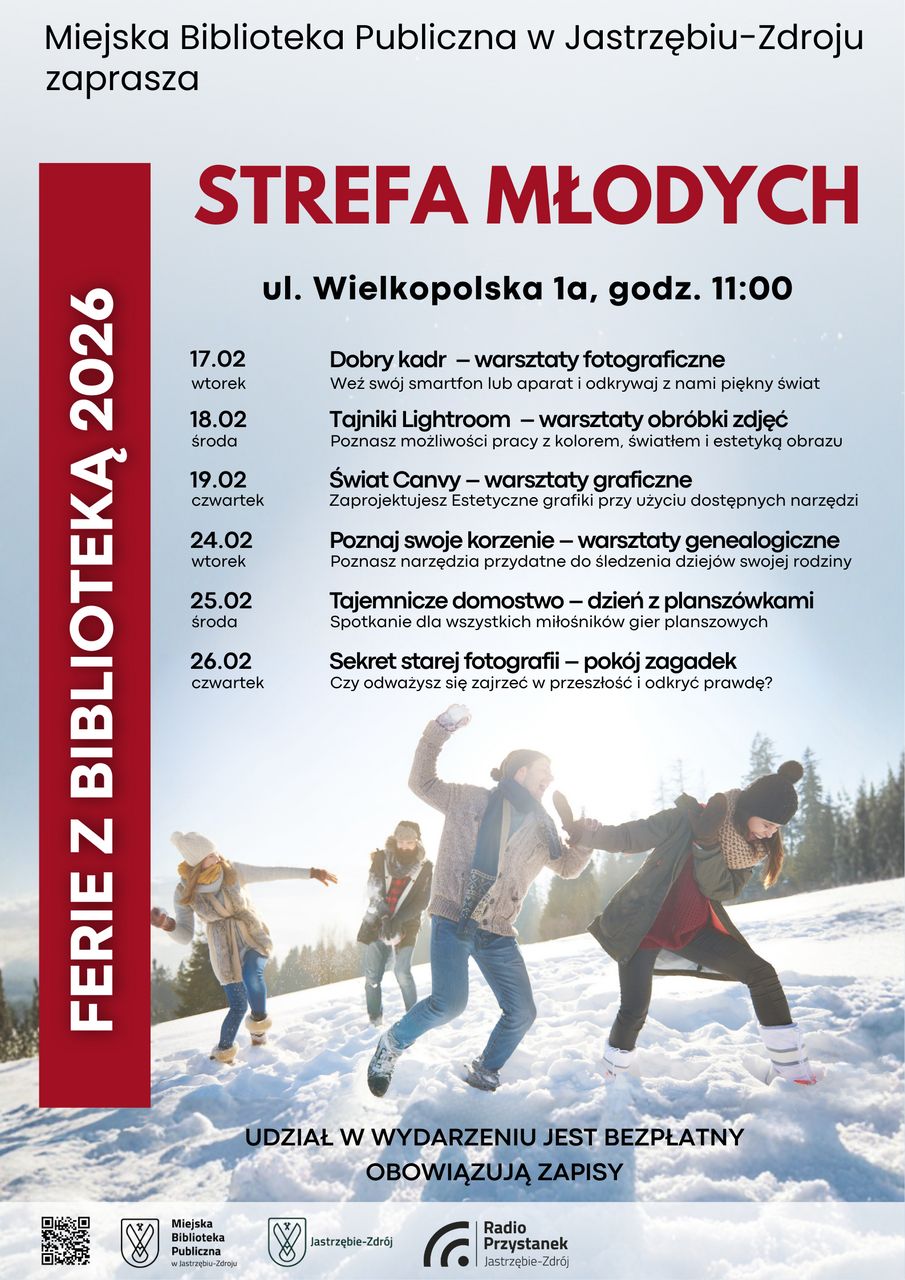 Dodatkowo biblioteka zaprasza młodzież do Strefy Młodych, gdzie ferie upłyną pod znakiem kreatywności i odkrywania nowych pasji. W programie znalazły się m.in. warsztaty fotograficzne i graficzne, zajęcia z obróbki zdjęć, spotkania genealogiczne, dni z planszówkami oraz pokój zagadek. To propozycja dla tych, którzy chcą twórczo spędzić zimową przerwę, rozwinąć swoje umiejętności i dobrze się bawić w inspirującym gronie.