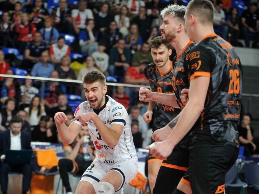 Jastrzębski Węgiel: Patry, Toniutti, Gladyr, Huber, Fornal, Szymura, Popiwczak (libero) oraz Sclater, Skruders
