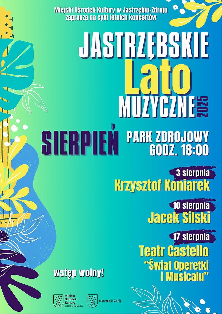 W sierpniu, podobnie jak w mijającym miesiącu, Jastrzębie-Zdrój wypełni się dźwiękami muzyki, dzięki cyklowi koncertów „Jastrzębskie Lato Muzyczne”. W okresie wakacyjnym, w Parku Zdrojowym, od godziny 18:00, mieszkańcy i goście będą mogli nadal uczestniczyć w serii występów muzycznych: Krzysztofa Koniarka, Jacka Silskiego oraz Teatru Castello.