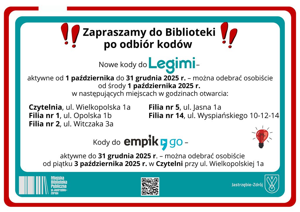 Nowe kody do Legimi – aktywne od 1 października 2025 r. do 31 grudnia 2025 r. – można odebrać osobiście od środy, 1 października 2025 r. w następujących miejscach w godzinach otwarcia: