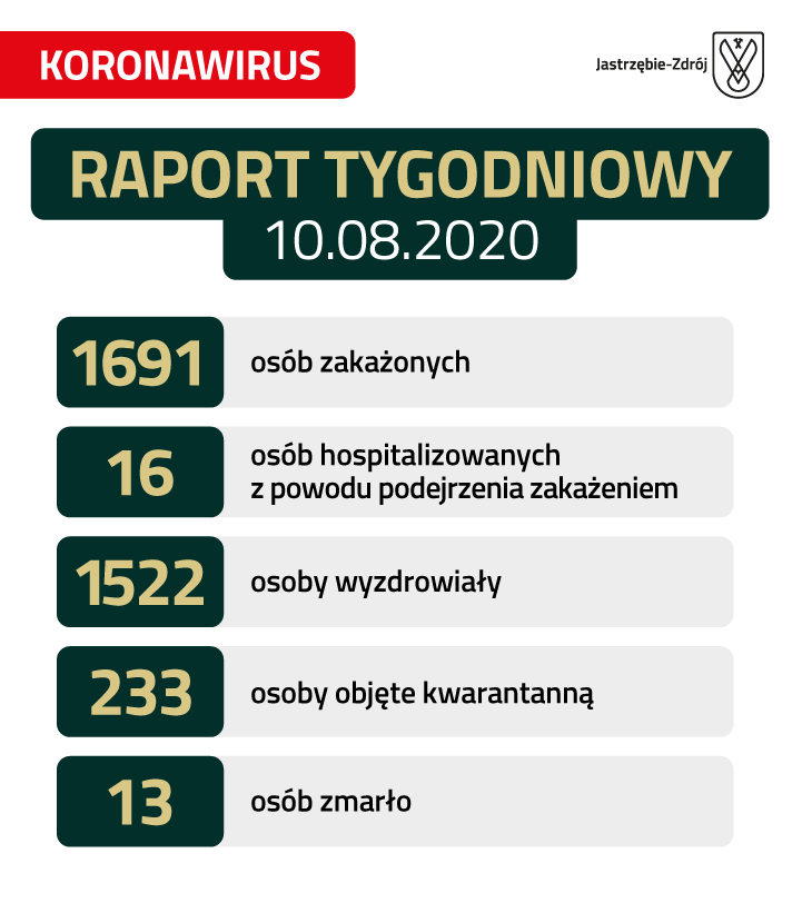 Według informacji podanych przez sanepid 10 sierpnia, od początku epidemii w Jastrzębiu-Zdroju koronawirusem zakaziło się 1691osób, z czego 1522 uznano już za wyleczone.