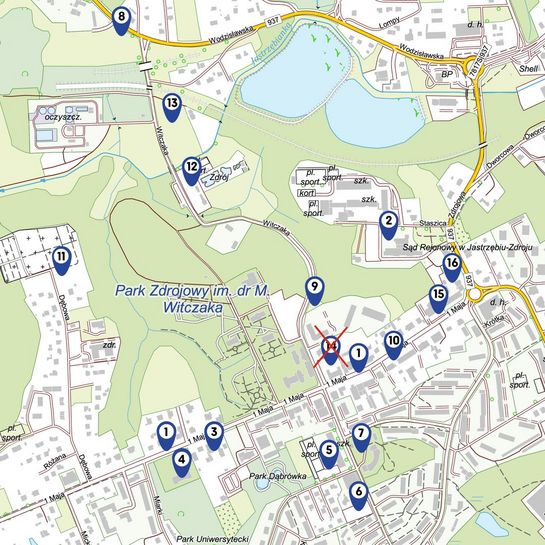 UWAGA: Odcinek ul. 1 Maja (Restauracja Dąbrówka – Kościół NSPJ) zamknięty dla ruchu pojazdów. Dojazd do Parku Zdrojowego od strony dzielnicy Moszczenica i ul. Karola Miarki tylko do Restauracji Dąbrówka, ul. 1 Maja 49.