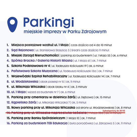 Jak wiadomo, zaparkowanie samochodem podczas dużych imprez plenerowych nie jest łatwe. Dlatego proponujemy Wam 16 lokalizacji, gdzie możecie zostawić swój pojazd przyjeżdżając na wydarzenia organizowane w Parku Zdrojowym. Najbliższe już w sobotę-niedziele.