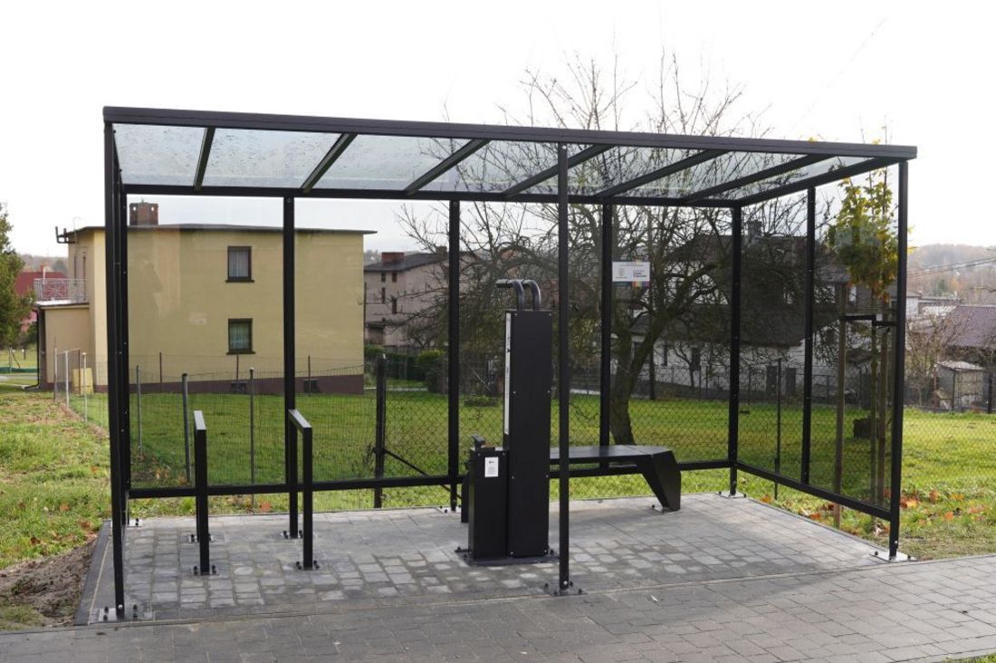 Pod wiatą znalazła się także bowiem stacja naprawcza rowerów. Elementy wyposażenia wiaty uzupełnia także ławka. Dodatkowo teren wokół przystanku rowerowego został utwardzony.