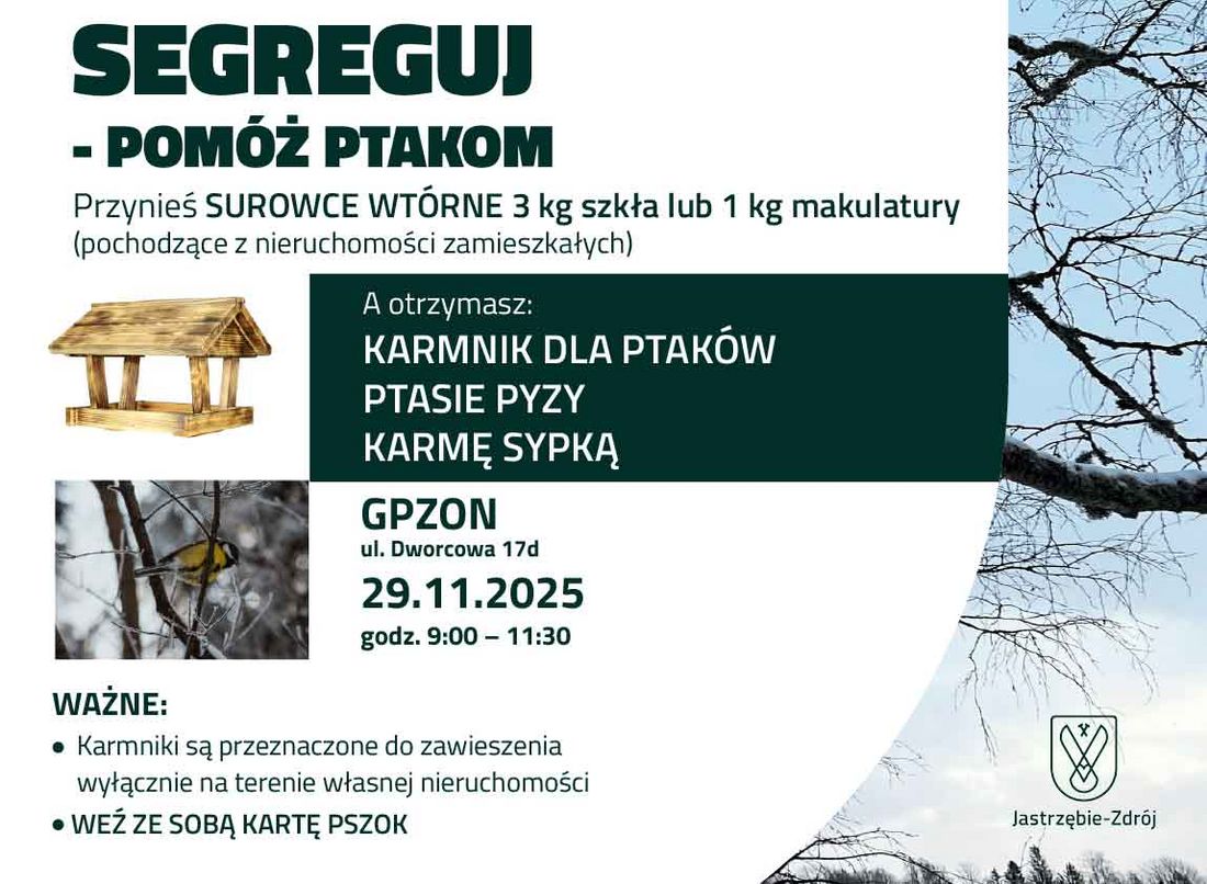 W najbliższą sobotę, tj. 29 listopada, między godziną 9:00 a 11:30, w Gminnym Punkcie Zbierania Odpadów Niebezpiecznych będzie można otrzymać karmnik oraz karmę w zamian za oddane surowce wtórne. Akcję przygotowali pracownicy Wydziału Ochrony Środowiska i Rolnictwa we współpracy z GPZON.