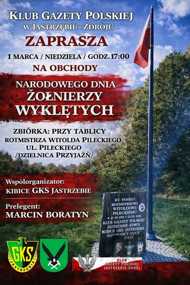 Natomiast o godzinie 17:00, w niedzielę, 1 marca, Klub Gazety Polskiej wraz z kibicami GKS Jastrzębie zapraszają pod tablice ku pamięci Rotmistrza Witolda Pileckiego na obchody Narodowego Dnia Żołnierzy Wyklętych. Prelekcję podczas, której będzie można dowiedzieć się więcej o Żołnierzach Wyklętych poprowadzi Marcin Boratyn.
