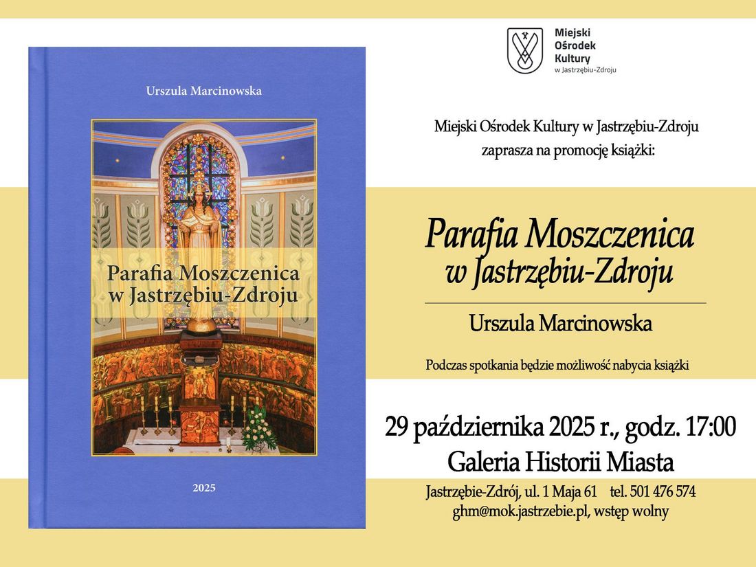 Tematem spotkania będzie najnowsza publikacja autorstwa Urszuli Marcinowskiej pt.: „Parafia Moszczenica w Jastrzębiu-Zdroju”, poświęcona historii moszczenickiej parafii w 100-lecie jej restytucji.