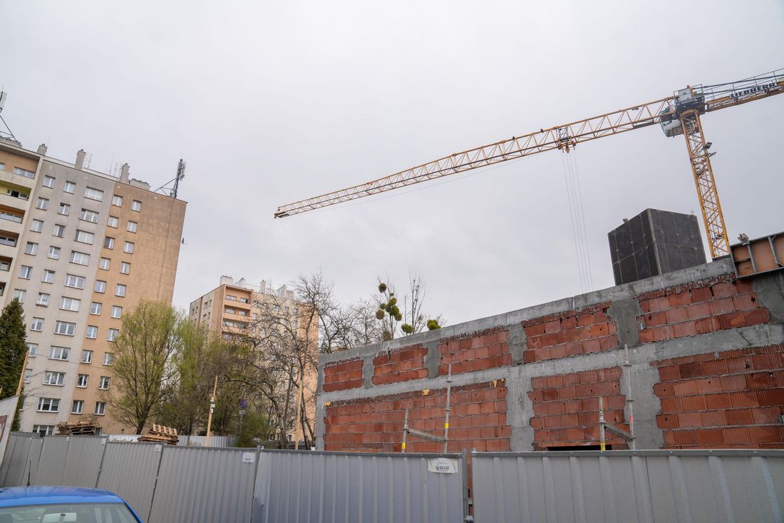 Plac budowy przedszkola na ulicy kaszubskiej widać mury budynku żuraw stertę drewnianych palet i samochód