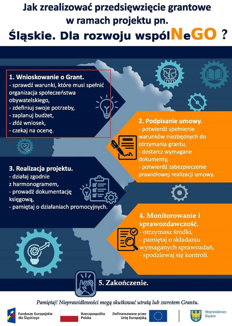 Projekt “Śląskie. Dla rozwoju wspólNeGO” realizowany jest w okresie od 01.09.2025 r. do 31.12.2028 r. i stanowi element wsparcia dialogu obywatelskiego ze środków Europejskiego Funduszu Społecznego Plus Programu Fundusze Europejskie dla Śląskiego dla Śląskiego na lata 2021-2027. Założeniem projektu jest udzielanie wsparcia finansowego w postaci grantów na rozwój potencjału mniejszym organizacjom, których roczne przychody są niższe niż 150 tysięcy, oraz które działają co najmniej 2 lata.