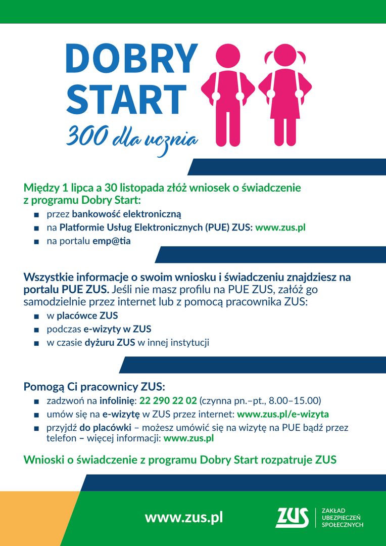 Od 1 lipca do 30 listopada można składać wnioski o świadczenie z rządowego programu Dobry Start (tzw. 300 plus). Od tego roku przyznawaniem i wypłatą tych świadczeń zajmuje się ZUS.