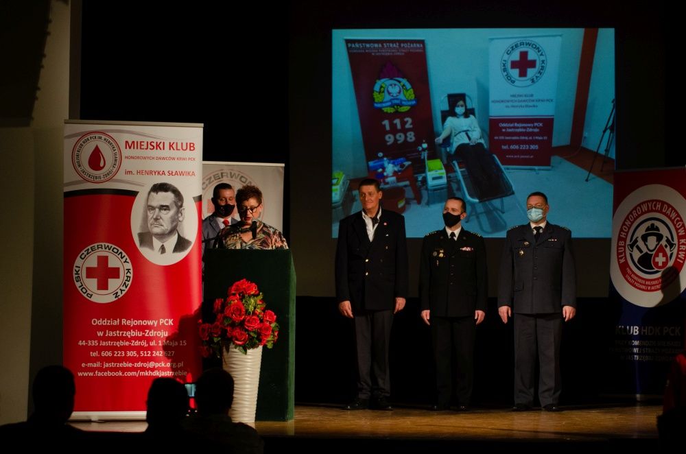 Andrzej Kinasiewicz uhonorował „Odznaką Honorową PCK" III stopnia Renatę Reichman sekretarz OR PCK w Jastrzębiu-Zdroju oraz Piotra Jarosławskiego wiceprezesa OR PCK w Jastrzębiu-Zdroju. OH PCK IV stopnia odznaczony został st. ogn. Tomasz Tierientiew, Prezes Klubu HDK PCK przy KM PSP w Jastrzębiu-Zdroju i członek Zarządu OR PCK W Jastrzębiu-Zdroju. OH PCK IV stopnia przyznana Komendzie Miejskiej Państwowej Straży Pożarnej w Jastrzębiu-Zdroju zostanie wręczona podczas uroczystości z okazji święta strażaków obchodzonego w dniu 4 maja 2022 r., tj. w dniu święta Świętego Floriana, patrona strażaków. Odznakę resortową Ministerstwa Zdrowia „Honorowy Dawca Krwi - Zasłużony dla Zdrowia Narodu” nadaną przez Ministra Zdrowia po oddaniu minimum 20 litrów krwi pełnej otrzymali: Banaszek Piotr, Grochowski Piotr, Kercher Andrzej, Leyk Roman i Plata Teofil. Odznaczenia dokonała Gizela Kowol, Dyrektor RCKiK w Raciborzu. Odznakę „Zasłużony Honorowy Dawca Krwi I stopnia” po oddaniu minimum 18 litrów krwi pełnej otrzymali Panowie: Jachym Marcin KMP, Nowak Sebastian ZHP, Tierientiew Tomasz PSP i Wicherek Dariusz. Odznakę „Zasłużony Honorowy Dawca Krwi II stopnia” po oddaniu minimum 12 litrów krwi pełnej otrzymali: Brachaczek Wojciech PSP, Mazur Łukasz PSP i Szymichowski Grzegorz. Odznakę „Zasłużony Honorowy Dawca Krwi III stopnia” po oddaniu minimum 6 litrów krwi pełnej otrzymali: Nowak Joanna ZHP i Antoni Weissmann, sołtys sołectwa Szeroka. Odznaczenia dokonał Andrzej Kinasiewicz, Prezes Śl. OO PCK i Piotr Kula, Prezes OR PCK w Jastrzębiu-Zdroju. Natomiast 25 członków MK HDK PCK im. Henryka Sławika i Janeta Szymon PSP otrzymali z rąk dyrektor Gizeli Kowol medal RCKiK za oddanie minimum 25 l krwi pełnej.