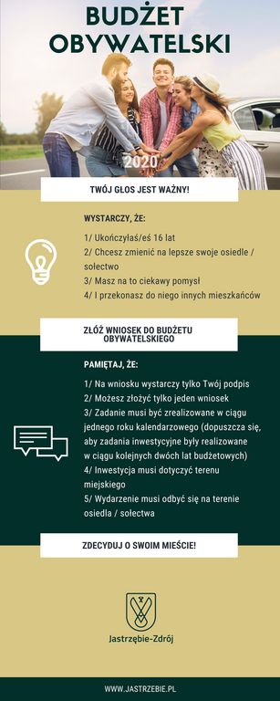 Jastrzębianie zdecydują w jaki sposób rozdysponować ponad 2 mln złotych w ramach budżetu obywatelskiego na 2020 rok. Propozycje można składać od 1 do 21 kwietnia.