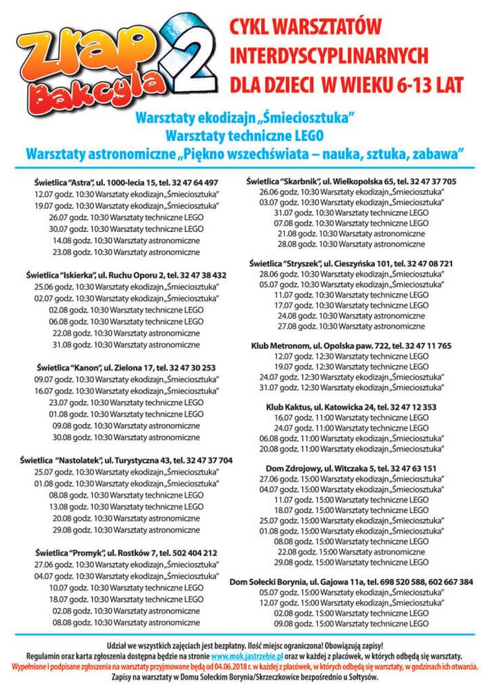 Regulamin oraz karta zgłoszenia dostępna będzie na stronie www.mok.jastrzebie.pl oraz w każdej z placówek, w których odbędą się warsztaty.