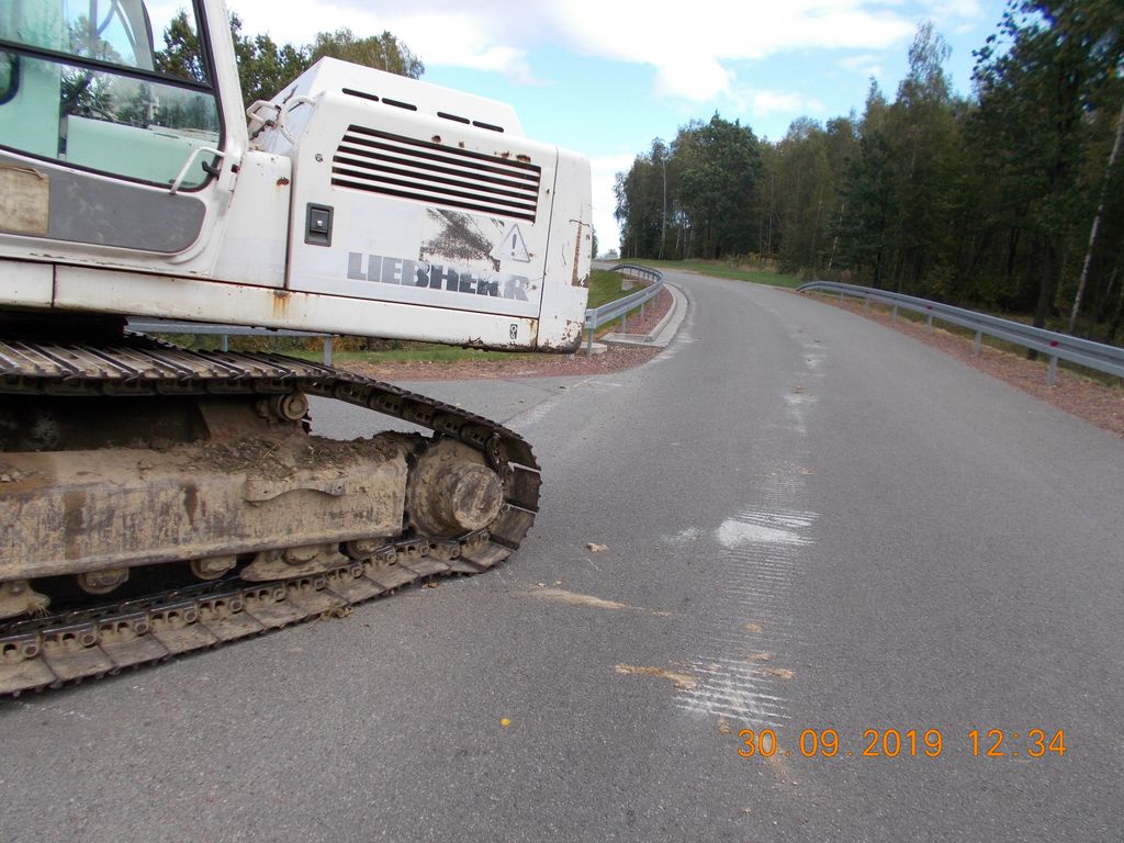 Koparka wykonująca prace na poboczu ul. Długiej zniszczyła nawierzchnie asfaltową.