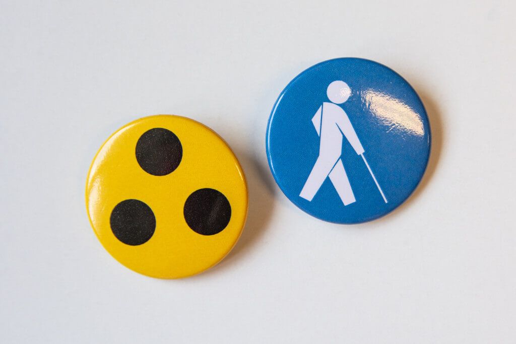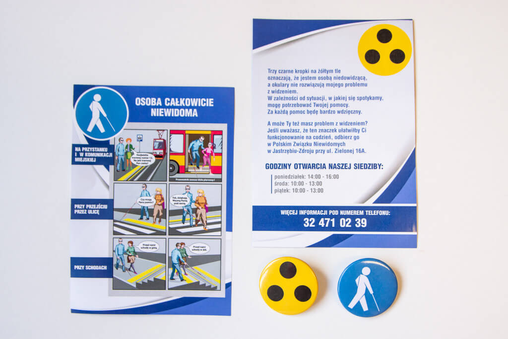 Jednak nie zawsze jesteśmy w stanie rozpoznać, czy mamy przed sobą właśnie taką osobę. Dlatego Polski Związek Niewidomych w Jastrzębiu-Zdroju proponuje doskonałe rozwiązanie.Mowa o specjalnych przypinkach, które funkcjonują już w wielu krajach. Do wyboru są dwa motywy – przypinka żółta z trzema czarnymi kropkami, oraz niebieska z symbolem osoby z laską dla niewidomych.