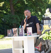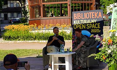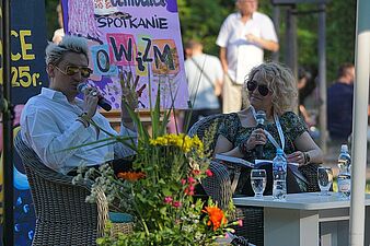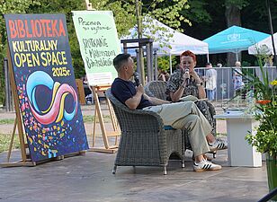 Mateusz Banaszkiewicz, członek Kabaretu Młodych Panów, opowiadał o kulisach działalności kabaretowej i książce wydanej z okazji dwudziestolecia istnienia grupy. Publiczność mogła zajrzeć za kulisy „życia w kabarecie” i posłuchać anegdot o scenie i publiczności.