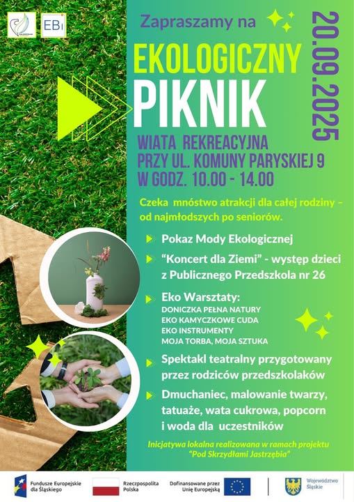 Stowarzyszenie EBI zaprasza do udziału w kolejnej inicjatywie - Ekologicznym Pikniku dnia 20 września, w godzinach 10:00 - 14:00 na terenie wiaty rekreacyjnej przy ul. Komuny Paryskiej 9.