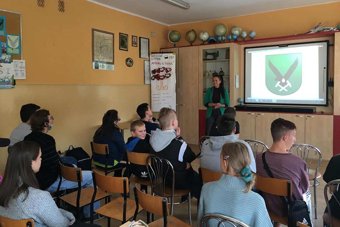 Anna Lerch-Wójcik prowadzi wykład w klasie pełnej uczniów.