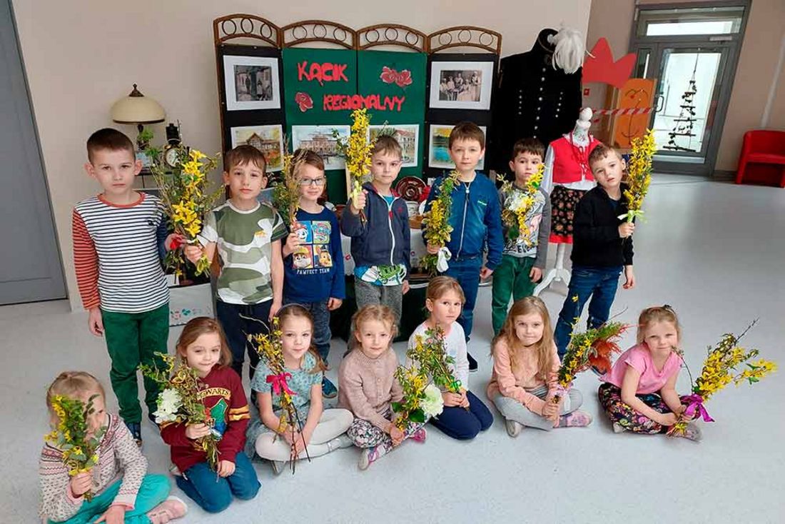 Przedszkole korzysta z bogatej oferty, którą zapewnia nam miejscowe Koło Gospodyń Wiejskich i zespół regionalny „Druga Młodość”. W ramach świątecznych przygotowań przedszkolaki miały okazję utrwalić wielkanocną tradycję - samodzielnie wykonanie palm wielkanocnych. Dzięki obfitości materiałów i bezcennej pomocy doświadczonych Pań z zespołu i KGW każdy przedszkolak zabrał do domu piękną, kolorową palmę. Przy tak intensywnej pracy nie zabrakło pysznego poczęstunku - ciasteczka zniknęły z kosmiczną prędkością w roześmianych buziach dzieciaków.