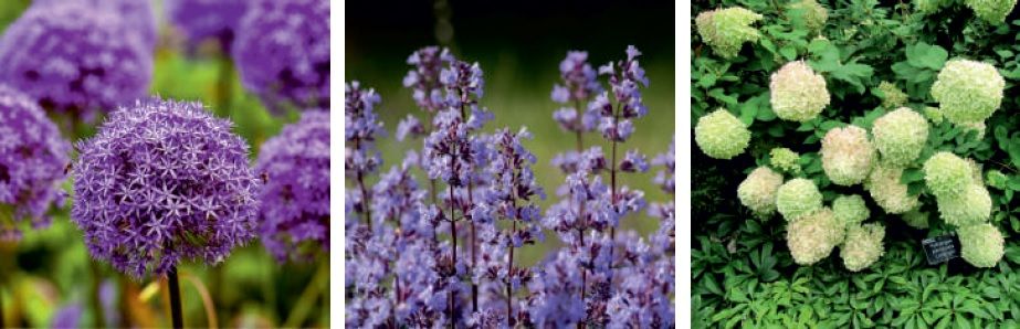 kocimiętki, hortensji bukietowych oraz wisterii. Całość uzupełniają różne gatunki traw ozdobnych,